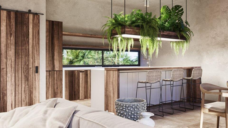 Accommodation of 65m², with separate double bedroom, spacious living room with integrated open plan kitchen, bathroom and with large garden and views to the pool.
